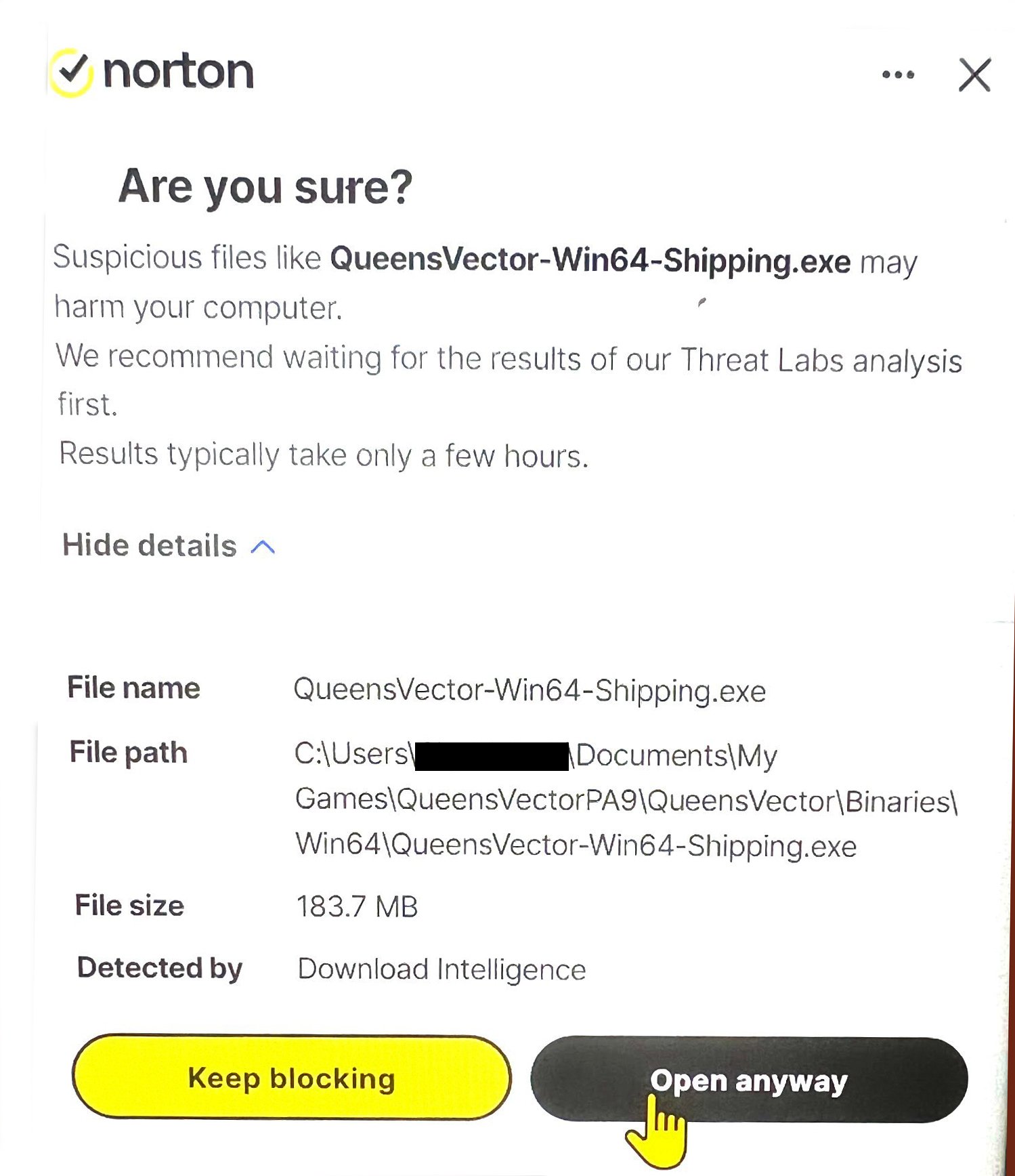 Since this is an internal, unsigned build, Norton Antivirus will likely flag QueensVector-Win64-Shipping.exe. This is a false positive based on the file's lack of a "digital signature."